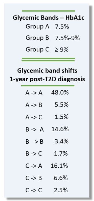 Looking specifically at shifts among glycemic bands from diagnosis to 1 year, 48% of individuals began in band A and maintained that status, 16.1% improved from band C to band A, and 14.6% improved from band B to band A.
