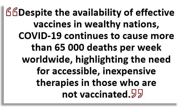 "Despite the availability of effective vaccines in wealthy nations,” wrote study authors in JAMA Network Open, “COVID-19 continues to cause more than 65 000 deaths per week worldwide, highlighting the need for accessible, inexpensive therapies in those who are not vaccinated.” They add the need is particuarly important in patients with moderate to severe disease.