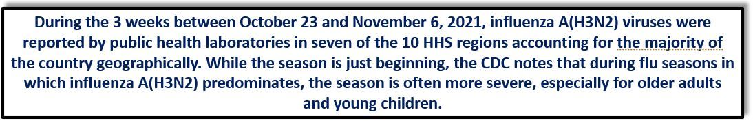 The COVID-19 pandemic significantly disrupted flu activity in 2020, likely a result of preventative measures such as mask wearing and social distancing. Now, as restrictions have relaxed, seasonal flu case numbers are back up with New Mexico, Georgia, and Rhode Island seeing the highest numbers. The increase of seasonal flu cases when combined with the ever-present threat of COVID-19 has experts urging even more strongly that everyone be vaccinated against COVID-19, including booster shots, as well as against seasonal influenza.