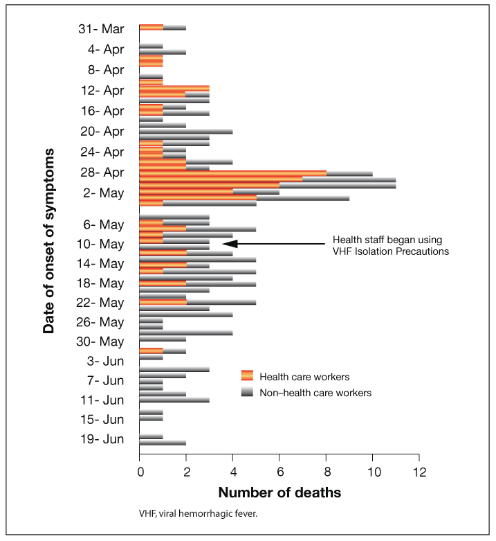 Containment is an essential tool in controlling the spread of filoviruses. Patients with suspected infection must be isolated from other patients, and strict barrier nursing techniques must be instituted. In the Kikwit outbreak in 1995, transmission was markedly reduced after barrier nursing practices were implemented (Figure 2).