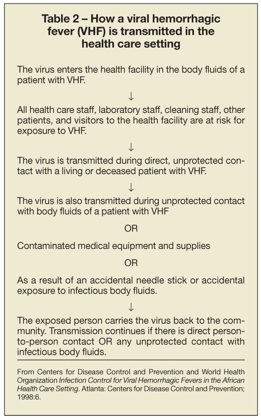 Ebola virus has been notably spread at burial ceremonies in Africa where mourners have direct contact with the body of the deceased. Because of work-related exposure to contaminated syringes and needles, laboratory workers are at particularly high risk for infection with Ebola and Marburg viruses as well.7 Indeed, because all body fluids from patients with EHF and MHF are infectious, the risk to health care providers is high. During the 1995 EHF outbreak in Kikwit, Zaire (now the Democratic Republic of the Congo), one-fourth of the cases were in health care workers.8 It is now established that failure to use correct infection control precautions and the use of inadequate barrier nursing procedures were the primary causes (Table 2).