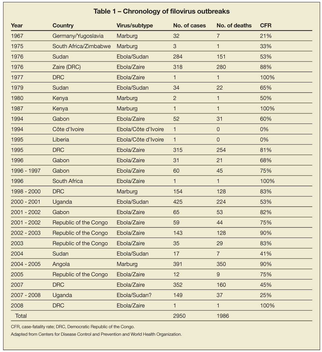 coverage when outbreaks occur. The causative organisms are found in tropical Africa and the Philippines. They belong to the Filoviridae family. Clinical presentations of the viral infections they cause share many common characteristics. At least 6 Marburg virus outbreaks and 21 Ebola virus outbreaks have been documented to date (Table 1). More outbreaks have probably occurred in remote areas before good documentation efforts could be made. The infections can be difficult to study because outbreaks are sporadic and typically occur in high-conflict areas.