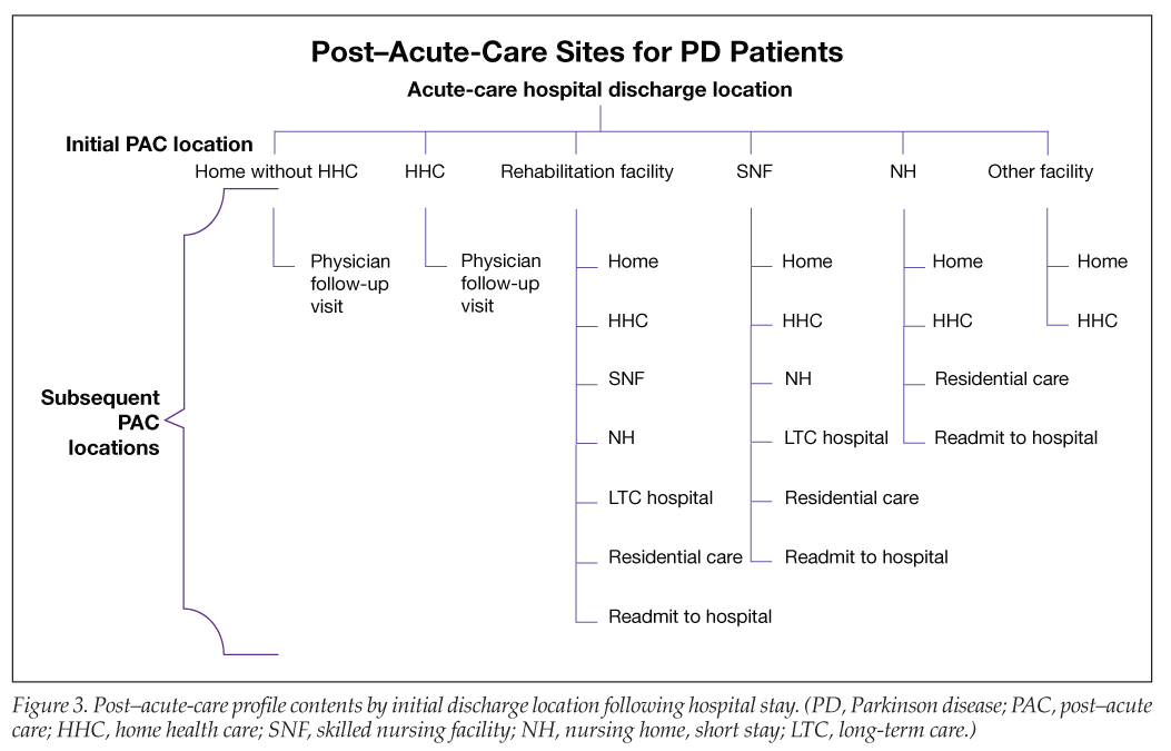 Chronic, noninstitutionalized with acute problem. Persons with an acute PD-related problem may be admitted or managed as outpatients. Details of the cost estimates and resource use profiles are provided in Tables 1 and 2, respectively. The data analysis for a 1-year period included examination of patients from NHIS-D who were hospitalized (n = 204,787), hospital discharges from state databases (n = 18,309; mean age, 77 years; 20% younger than 65 years), and acute (n = 103,787) and chronic care (n = 728,944) outpatient visits from NAMCS. During 1 year, 28% were hospitalized (mean cost, $16,447 per stay; LOS, 5.3 days). Of those discharged (98%), most received PAC services (Table 2) initially. Almost one-third (30%) were readmitted with a PD-related problem at least once (mean, 1.47; range, 1 - 16) during the next 12 months.
