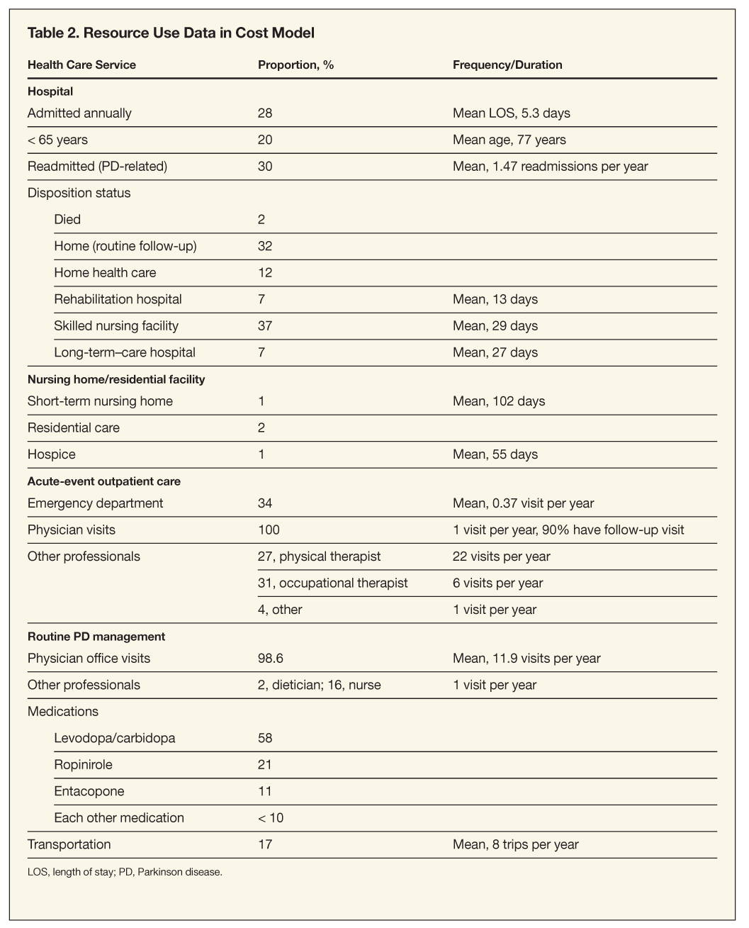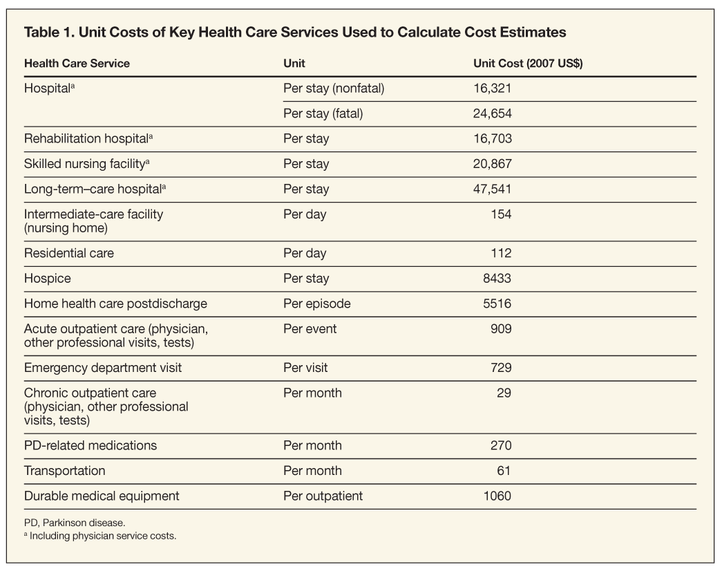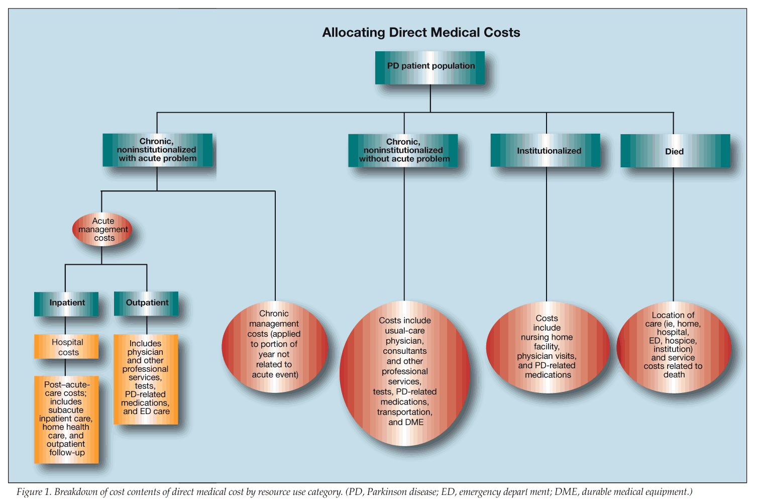 Until recently, “cost” studies of a given illness were typically compilations of all the financial consequences, reported in broad catego- ries, such as the previously referenced $6 billion annual cost estimate for PD. Although an impressive amount, this type of estimate alone is not informative to guide health care decisions. Cost estimates reported in sufficient detail at the level of the relevant components of the illness (eg, inpatient management, nursing home care) are more meaningful to clinicians and form the basis for inputs to an economic model that evaluates the cost-effectiveness of various therapies for PD. Thus, the objective of this study was to examine and report current and comprehensive costs associated with PD in the United States at a detailed level to help policymakers determine how to properly allocate funds and other resources that will be required to address the increasing health care demands of the PD population.