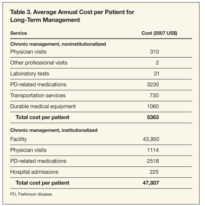 Chronic, noninstitutionalized. The annual direct medical cost for chronic medical care was estimated at $3573 (physician visits, tests, medications) per noninstitutionalized patient (Table 3). PD-related medications accounted for 90% of this cost. The cost increases to $5363 per person when transportation and durable medical equipment costs are included.