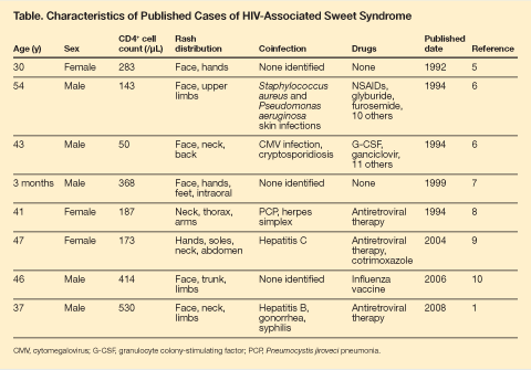 There are hundreds of non–HIV-associated cases of Sweet syndrome reported in the literature.2 Apart from the case presented by Johnson and colleagues,1 we are aware of only 7 other HIV-associated cases of Sweet syndrome (Table).5-10 In one of these cases, Sweet syndrome was the initial manifestation of HIV infection.7 Classic Sweet syndrome demonstrates a female predilection. Age at onset is most common in the fourth to seventh decades, but the syndrome can occur in infants, children, and the elderly. In the published cases of HIV-associated Sweet syndrome (Table), patients were, on average, 43 years of age (range, 3 months to 54 years) and were more frequently male. The mean CD4+ cell count in this HIV-infected group of patients was 307/µL (range, 50 to 530/µL).