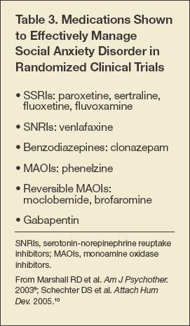 The SAD literature demonstrates 2 overall patterns: (1) medication and CBT appear equally effective; and (2) medication tends to work somewhat faster than CBT, but CBT produces more significant results, with lower rates of relapse.7,8 If a patient has paralyzing symptoms, has severe depression, or prefers medication, typically he or she is initially given medication, which is sometimes combined with evidence-based psychotherapy; for other patients, psychotherapy treatment is considered after the clinician evaluates the patient’s response to the pharmacotherapy.