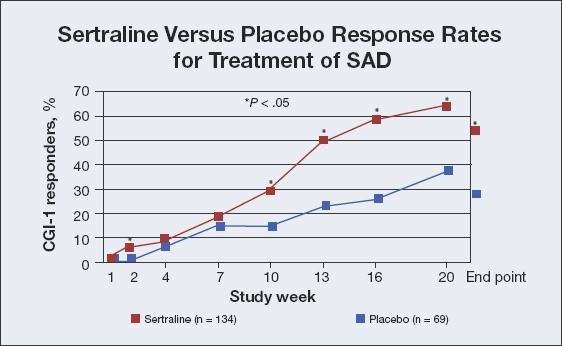 Relatively few studies examine either long-term treatment for persons with SAD or optimal length of treatment. However, there is solid clinical evidence of the long-term (up to 1 year) efficacy of the SSRI sertraline (Figure 2).9,12,13 There is no reason to suspect the findings will be any different for other related medications prescribed to treat persons with SAD. In general, practitioners can expect to achieve about a 50% improvement in response to medication, but there is significant individual variation in treatment response.9,11