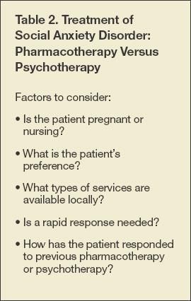 Treatment. When discussing treatment options with patients, clinicians should consider several factors: pharmacotherapy; psychotherapy; or pharmacotherapy combined with psychotherapy, either simultaneously or sequenced (Table 2). With respect to providing evidence-based psychotherapy, it is often difficult for practitioners to find training for themselves or to locate a clinician who specializes in CBT outside major US cities to whom to refer a patient. Educating patients about this option is necessary but can become awkward if the treatment is not easily obtainable. Although rigorous controlled trials have demonstrated the efficacy of CBT over the past 2 decades, most practitioners do not have specialized training because such training is expensive, programs are difficult to find, and older clinicians typically were not initially trained in the basic principles and skill sets of CBT.6 On the other hand, there may be reasons to avoid prescribing medications (eg, the patient is pregnant or nursing; drug-drug interaction concerns) or a patient may have strong preferences regarding treatment, in which case psychosocial treatment should be provided or sought for the patient.