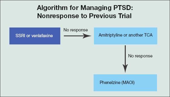 Figure 3. Evidence-based treatment of posttraumatic stress disorder (PTSD) begins with an SSRI or venlafaxine. If the patient does not respond, this medication is discontinued and the patient begins a trial of amitriptyline or another tricyclic antidepressant (TCA). If this fails to adequately control symptoms, changing to a monoamine oxidase inhibitor (MAOI), such as phenelzine, might improve the patient’s outcome.