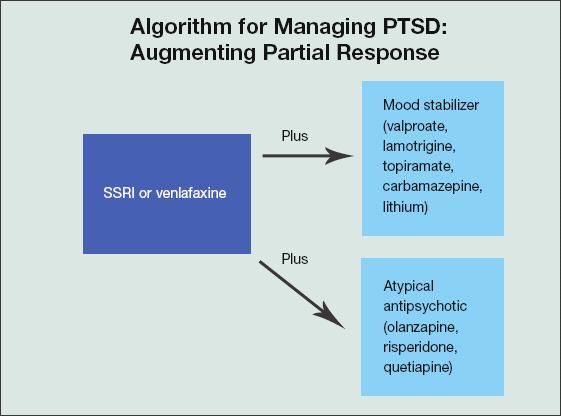Figure 4. A person with posttraumatic stress disorder (PTSD) who responds only partially to an SSRI or venlafaxine may respond to the addition of a mood stabilizer (valproate, lamotrigine, topiramate, carbamazepine, lithium) or an atypical antipsychotic (olanzapine, risperidone, quetiapine) to his or her evidence-based medication regimen.