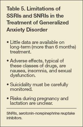 Another limitation in the GAD literature is the lack of long-term (more than 6 months) data on patient outcomes associated with the use of SSRIs and SNRIs. Most researchers recommend continuing to give patients medication for at least 1 year and slowly tapering off the medication only after several months of stable symptom improvement. Patients often fear a relapse-in other words, they are worriers about this as well-and the use of CBT techniques may be particularly effective in this situation if tapering off the medication is advisable. Ultimately, once informed about their choices, patients will need to make treatment decisions themselves. Other limitations of treating persons with GAD using SSRIs and SNRIs are listed in Table 5.