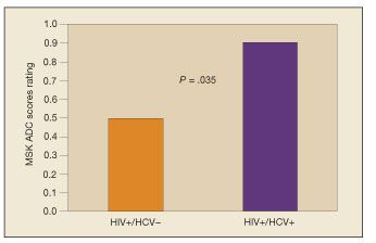 Figure 1.Memorial Sloan-Kettering Cancer Center AIDS Dementia Complex (MSK ADC) score rating. Of 31 randomly matched HIV-infected subjects without hepatitis C virus (HCV) infection and HIV/HCV-coinfected subjects paired by MSK ADC score rating, HIV/HCV-coinfected subjects were statistically significantly more impaired neurocognitively than HIV-infected subjects without coinfection (using ANOVA). (MSK ADC score rating: 0.0 = no impairment, 0.5 = subclinical/equivocal impairment, 1.0 = HIV-associated dementia.)