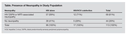 The overall predominance of DSPN was high in both groups. While this appeared to be higher in the HIV/HCV-positive group (71% vs 59%), this was merely a trend. The results are illustrated in the Table and Figure 3. No serum specimens tested positive for cryoglobulins, and all CSF glutamine levels were within normal limits.