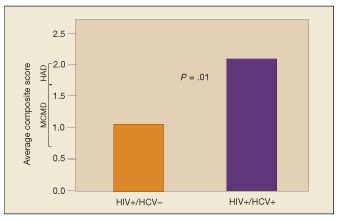 Figure 2.Primary neurocognitive composite scores. Of 31 randomly matched HIV-infected subjects without hepatitis C virus (HCV) infection and HIV/HCV-coinfected subjects, there was a statistically significant between-group difference based on a composite primary neurocognitive diagnosis, with the coinfected group being more impaired (using ANOVA). (HAD, HIV-associated dementia; MCMD, minor cognitive-motor disorder.)