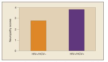 Figure 3.Neuropathy scores. There was a trend toward a greater prevalence of distal predominantly sensory peripheral polyneuropathy (DSPN) in subjects coinfected with HIV and hepatitis C virus (HCV) (using ANOVA). (0 = no DSPN, 1 = equivocal DSPN, 2 = possible DSPN, 3 = probable DSPN, 4 = definite DSPN.)