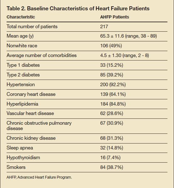 Descriptive results. The baseline characteristics of HF patients who enrolled in the program are shown in Table 2. The mean age of the 217 patients enrolled was 65.3 ± 11.6 years. All patients were classified as having NYHA class III/IV or ACC/AHA stage C/D HF. The average number of comorbidities was 4.5 per patient; the majority of patients had hypertension and hyperlipidemia in addition to HF. Other common comorbidities included diabetes mellitus, coronary artery disease, chronic obstructive pulmonary disease, and chronic kidney disease. Many patients also had a history of smoking.