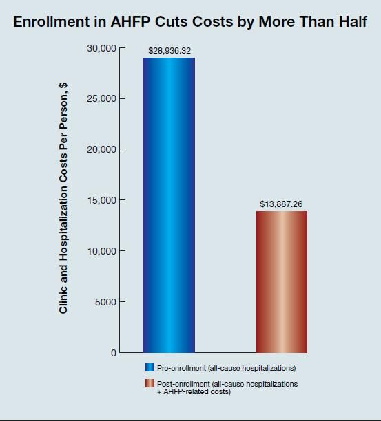 Figure. Post-enrollment hospitalization costs for heart failure patients who participated in the Advanced Heart Failure Program (AHFP) were less than half of pre-enrollment hospitalization costs plus AHFP-related costs for annual savings of $15,049.06 per patient.