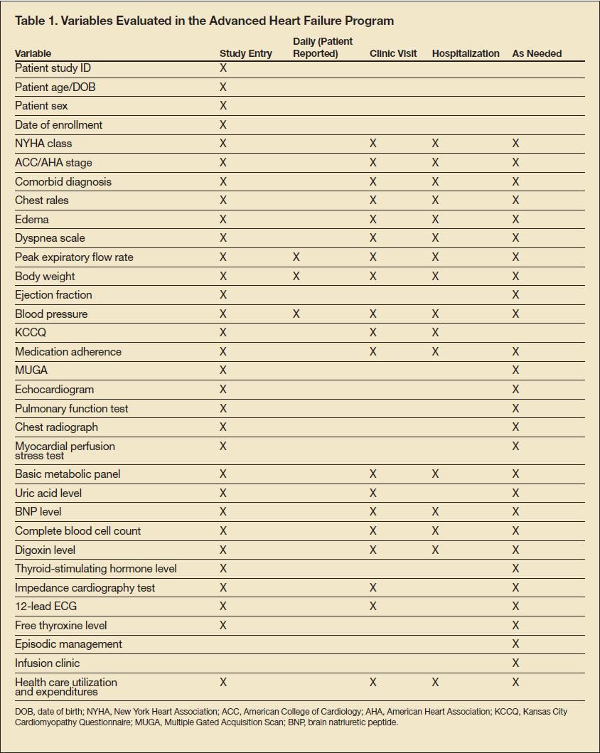 The goals of the AHFP were to decrease hospital admission/readmission rates, decrease health care expenditures, and improve the quality of life (QOL) for persons with advanced HF. Health care professionals participating in the AHFP included a cardiologist, internal medicine specialist, nurse practitioner, nurse, case managers, physician assistant, pharmacist, and clinical researchers. The pharmacist involved in the AHFP had clinical and research responsibilities. Clinical responsibilities included discussion with the HF treatment team about appropriate medications and doses, monitoring and patient counseling of medications, and evaluation of patient adherence. Research responsibilities included preparation of clinical protocol, database development, analysis of data, and manuscript preparation.