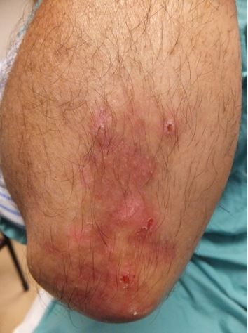 A pruritic, scaly rash appeared on this 42-year-old man's elbows, knees, lower back, and buttocks. Can you ID?