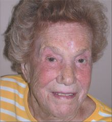 As one can see, the patient has retained the capacity to smile (Figure); this photograph was taken 2 days after initiation of cephalexin therapy for facial cellulitis that complicated the breach in the skin barrier. We had planned to use prednisone as well, because of the extent of the allergic-type reaction. However, her son asked that we not do so because this agent had exacerbated her confusion on a previous occasion. We therefore limited our anti-inflammatory treatment to loratadine. We were very pleased with the resolution of both erythema and the remaining edema in the interim.