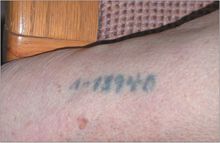 You might suspect factitious tattooing if the patient were younger than 70 years: children were slaughtered almost without exception in the camps, where the notorious “selections” (of prisoners who would go to the gas chamber) were based on the lack of ability to perform manual labor in support of the Nazi war effort. As a result, virtually no camp survivors are younger than 75 years today, 60 years after the liberation.