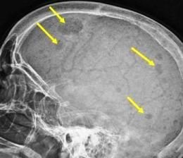 A 92-year-old woman presented with a 6-month history of progressively worsening fatigue, weight loss, generalized bone pain, and dyspnea on exertion. A skeletal survey found lytic lesions in the pelvis, sacrum, and calvarium (shown here).