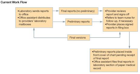Figure 1. Use case for electronic conversion: current manual laboratory work flow. It is assumed that electronic ordering is accurate and reflects current practices of providers. Supporting policies should be reviewed and revised accordingly to reflect changes. The time from the arrival of the laboratory report in the provider’s mailbox to sign-off is the suggested measure of quality improvement.