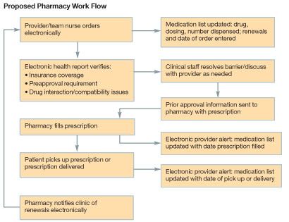 Figure 2. Proposed pharmacy work flow: electronic prescription ordering to in-house pharmacy. The goals are to order electronically, link pharmacy and clinical area, eliminate or reduce redundancy and errors, streamline fulfillment, and provide consistent notification of changes. It is assumed that formulary is on-line and available for viewing by clinical staff only.