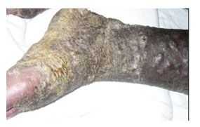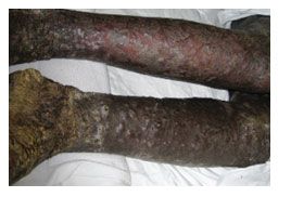 Figure 2. Chronic edema of the lower extremities with thickening, hyperpigmentation, and ulcerative nodules.