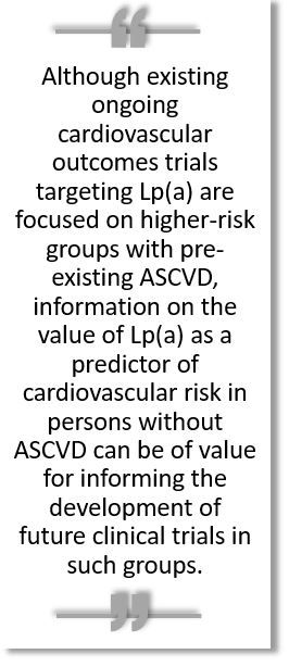 "Although existing ongoing cardiovascular outcomes trials targeting Lp(a) are focused on higher-risk groups with pre-existing ASCVD, information on the value of Lp(a) as a predictor of cardiovascular risk in persons without ASCVD can be of value for informing the development of future clinical trials in such groups," stressed Wong and colleagues.