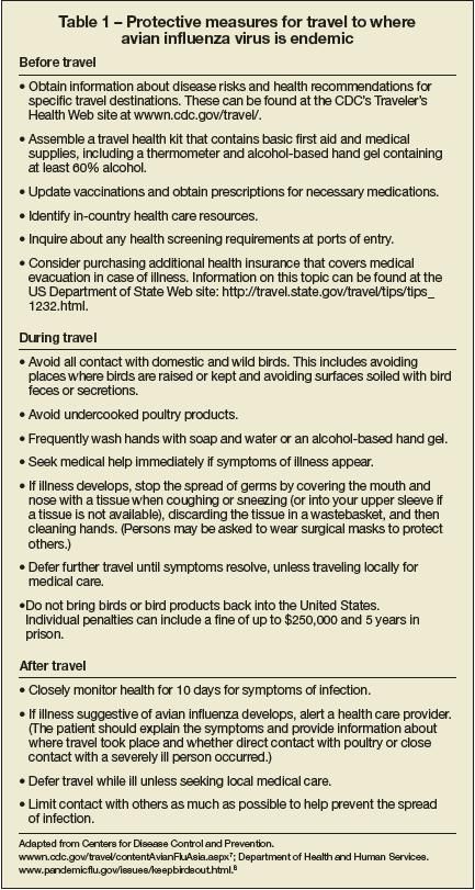 Currently, the CDC does not recommend that the general public avoid travel to countries affected by the H5N1 virus. However, it does recommend protective measures before, during, and after travel to regions where H5N1 is endemic (Table 1).7,8
