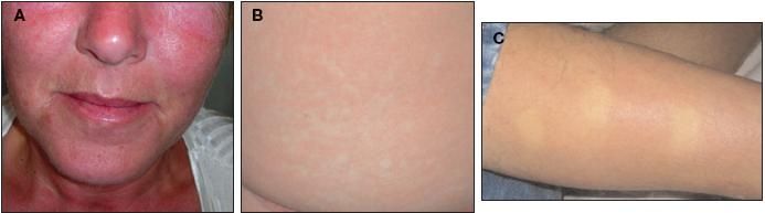 Clinical manifestationsof chikungunya fever includea blanching, evanescentrash (A, B) and peripheraledema (C). (From Simon F et al.Medicine [Baltimore].200724; used withpermission.)
