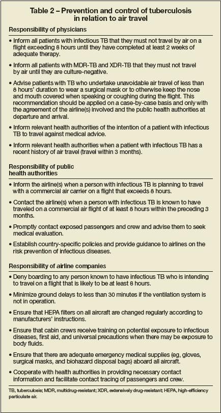 WHO guidelines state that short flights pose minimal risk of disease transmission, but flights of more than 8 hours may put passengers at increased risk, similar to the risk of TB transmission in other confined spaces. The highest risk is to those in proximity to the index case and is primarily limited to persons seated in the same row, to those 2 rows ahead or behind, and to crew-members working in the same cabin area as the index case. Physicians who counsel patients regarding international travel should familiarize themselves with these guidelines, especially as they pertain to physician responsibilities (Table 2).17