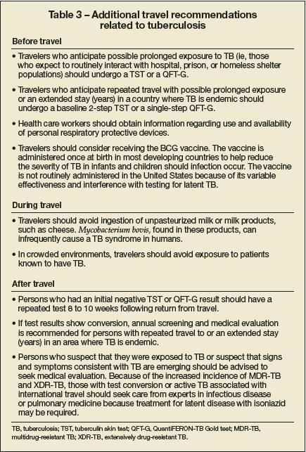 Greater than the risk of TB acquisition during international air travel is the risk of TB acquisition while visiting a country where the disease is endemic. Although the risk to short term travelers is low, the risk to longterm travelers to countries with a high incidence of TB may approach that of the local population and is especially high among health care workers. In a Dutch study of M tuberculosis infection among travelers to areas where the prevalence of TB is high, the risk of infection was 2.8 per 1000 person-months of travel for non-health care workers and 9.8 per 1000 person-months of travel for those with direct patient contact.19 Travel recommendations related to screening, prevention, and management of tuberculosis are outlined in Tables 2 and 3.20