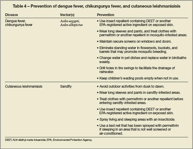 CHIKV infection should be a consideration in travelers with fever and arthralgias who have recently returned from areas where CHIKV is transmitted. Acute- and convalescent- phase serum specimens can be submitted to the CDC for testing through state health departments. Unfortunately, no vaccine or specific antiviral treatment exists. Therapy consists of supportive care, including rest, fluids, and antipyretics. Late-stage symptoms have demonstrated a dramatic response to short term corticosteroid therapy. The CDC suggests that infected persons should be protected from further mosquito exposure by staying indoors or under a mosquito net during the first few days of illness, thus limiting propagation of the transmission cycle.30 Recommendations for prevention are detailed in Table 4.