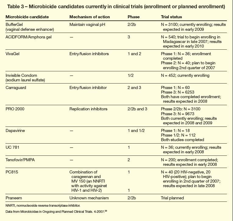 PRO 2000 gel, a polyanion with proven antiviral activity, has demonstrated safety and acceptability in clinical trials.21-24 The phase 3 trial is currently enrolling participants and should be completed in mid-2009.
