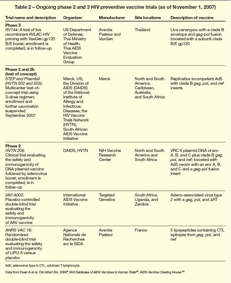 Several new products are currently in phase 1 and 2a trials. Strategies associated with these studies include new vaccine delivery methods (such as electroporation of DNA plasmids and use of novel adenovirus vectors), combination of antibody- and CTL-based vaccines, and use of novel adjuvants.9 Table 2 lists ongoing phase 2 and 3 trials.