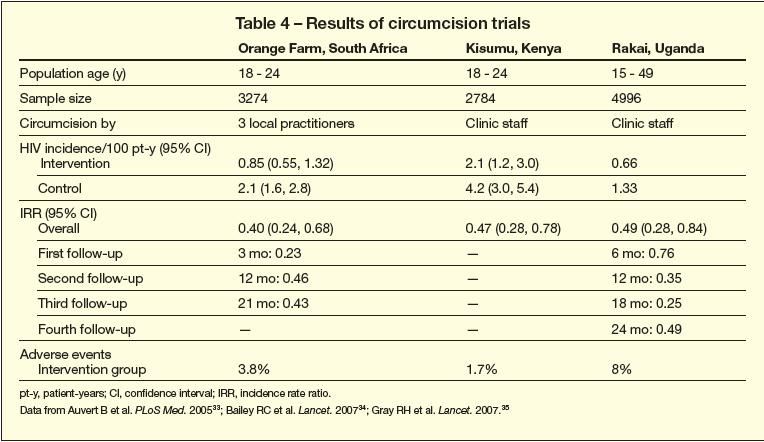 Results from 3 randomized clinical trials of the effect of circumcision on HIV acquisition have become available within the past 2 years (Table 4). In the first trial, South African participants were randomly selected to be offered a circumcision procedure (performed by experienced local practitioners) within 1 week of the start of the trial (intervention group) or at the end of the 21-month trial (control group). Circumcision was performed at study entry for men in the intervention group; follow-up was at 3, 12, and 21 months. Participants received counseling at each visit as well as genital examination, a questionnaire (detailing sexual risk behaviors), and HIV testing. The trial was halted after a mean follow-up of 18.1 months, when an interim analysis documented a large protective effect among the intervention group- a relative risk of 0.40, or 60% protection, against HIV (P < .0001)- whereupon circumcision was then offered to the control group.33
