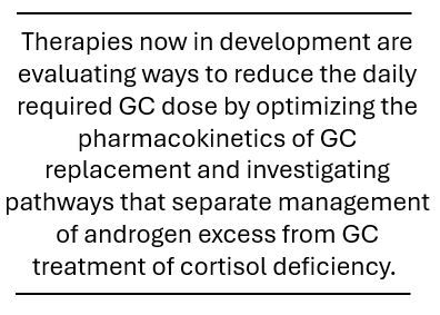 While effective, therapeutic regimens of glucocorticoids (GCs) are complex. Although physiologic doses are adequate to treat the inherent cortisol deficiency of CAH, supraphysiologic doses are typically required to regulate excess adrenal androgen production. Long-term exposure to high-dose GCs results in a myriad of adverse effects including obesity, hypertension, osteoporosis, and metabolic dysfunction.1-4