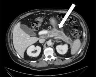 A 61-year-old obese man with newly diagnosed type 2 diabetes mellitus and hypertension presented to the emergency department with complaints of fatigue and poor oral intake. The patient also complained of a 10-lb weight loss that began approximately 2 weeks before admission but denied any significant abdominal pain, nausea, vomiting, steatorrhea, scleral icterus, and jaundice. He had no prior GI history, including a negative history of pancreatitis. He denied alcohol abuse but admitted to prior marijuana use.