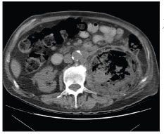 Figure 2 –A CT scan of the abdomen shows a large area of gas and fluid in the left renal fossa within the Gerota fascia.