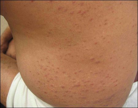 These pruritic pustules had appeared on the lower back of a 45-year-old white man and progressively spread to the entire back over a month. He had recently completed chemotherapy for chronic lymphocytic leukemia. Results of HIV testing were negative.