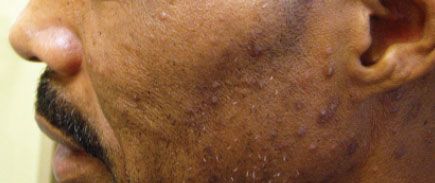 This HIV-positive, 48-year-old man presented with new-onset acne-like, pruritic lesions on his face. These erythematous painful papules had developed 2 months before presentation. The patient was taking antiretrovirals and trimethoprim/sulfamethoxazole for the HIV infection.