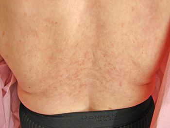 The husband of this 50-year-old obese woman noted that her back was discolored. Review of past medical history disclosed long-standing low back pain from partially herniated vertebral disks.