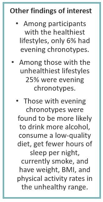 While they found similar distributions of age and race across chronotypes, Huang et al reported several notable differences, eg, participants with a definite evening chronotype were more likely to have ever worked night shifts, to have worked any rotating night shift work in the previous 2 years, and to have depression. Further, unhealthy lifestyle behaviors were more common among participants with a definite evening vs morning chronotype.