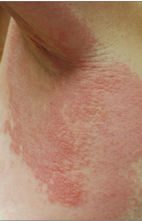 A drug reaction is a concern; however, biopsy results in patients with an id reaction often show eosinophils, adding to the diagnostic confusion. Psoriasis is also a concern, and biopsy may be required to rule it out. Dermatophyte infections are unlikely to be this extensive unless the patient has diabetes or is immunocompromised.