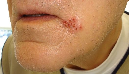 A 77-year-old man sought medical attention because of a painful group of “sores” near his mouth. He was just recovering from community-acquired pneumonia. This clustered grouping of small, shallow erosions surmounting a slightly indurated plaque is characteristic for oro-labial herpes simplex (“cold sores”). The attack was precipitated by the temporarily impaired immune response associated with his pulmonary infection.