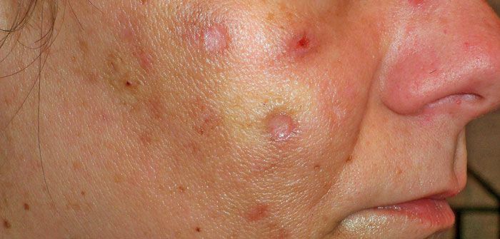 Treatment: This picture strongly suggests patient manipulation of more minor lesions. The patient was given a topical benzoyl peroxide–clindamycin gel to apply at bedtime, but was also strongly admonished to stop picking or scratching at lesions. It was further suggested that she stop “examining” her skin with a magnifying mirror!