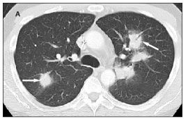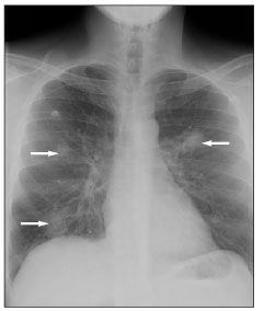 Figure 1.Chest radiograph demonstrating bilateral nodular densities (arrows).